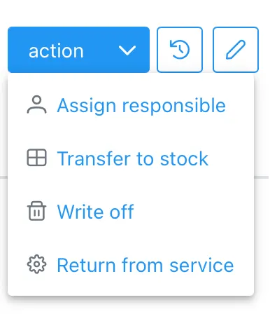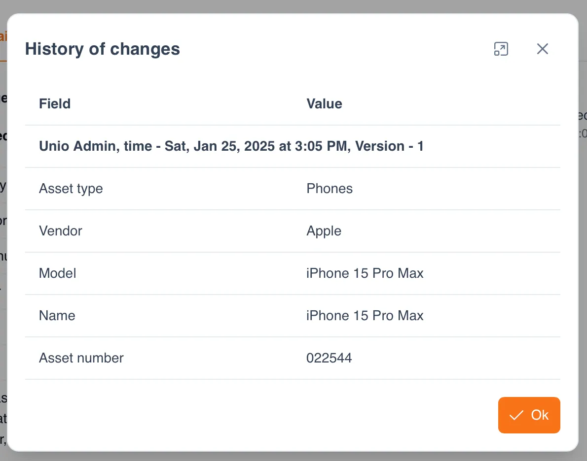 Section titled “Asset Change History”The system saves the complete history of changes to the asset fields. To view who, when, and what changes were made to the asset card, click the “Change History” button on the asset card.