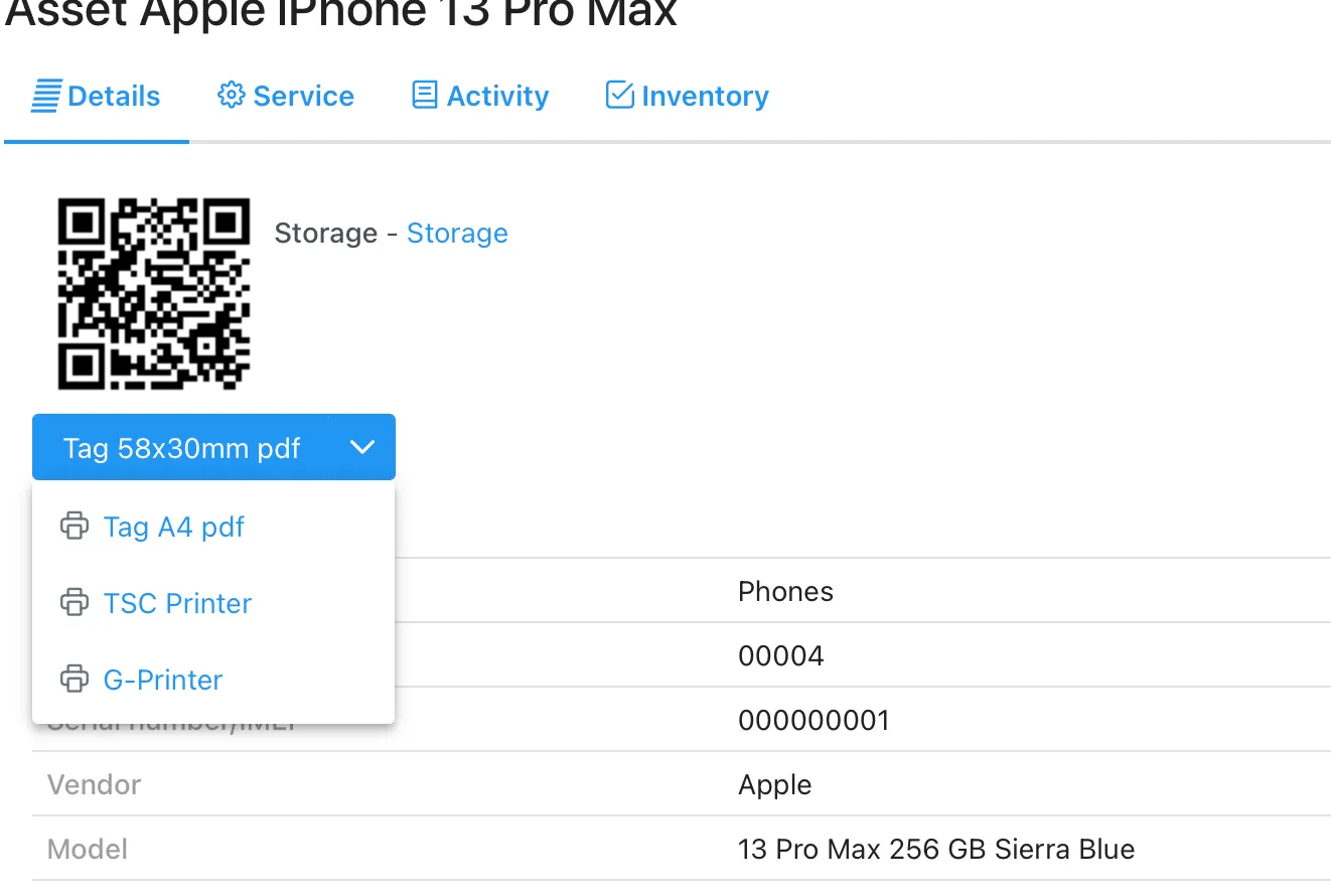 To print an asset label, go to the asset’s profile and click the print button, choosing one of the options:
