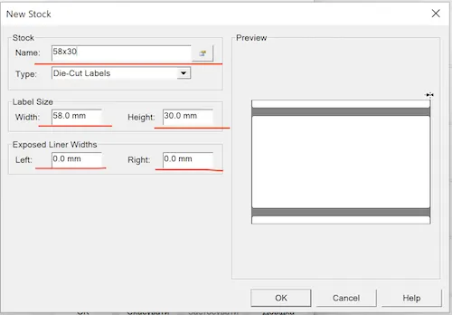 - Specify the paper parameters (58mm width, 30mm height). All other parameters should be 0. Name the format 58x30 and save.