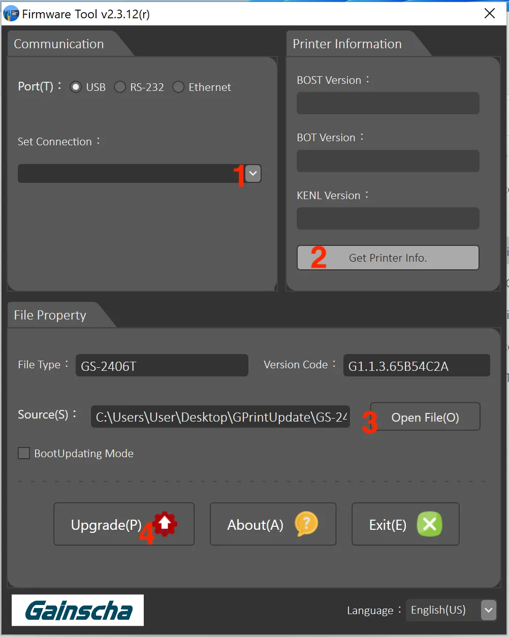 Section titled “Update the printer firmware to support Cyrillic font loading”Launch the Firmware Tool v2.3.12(r).exe utility.
