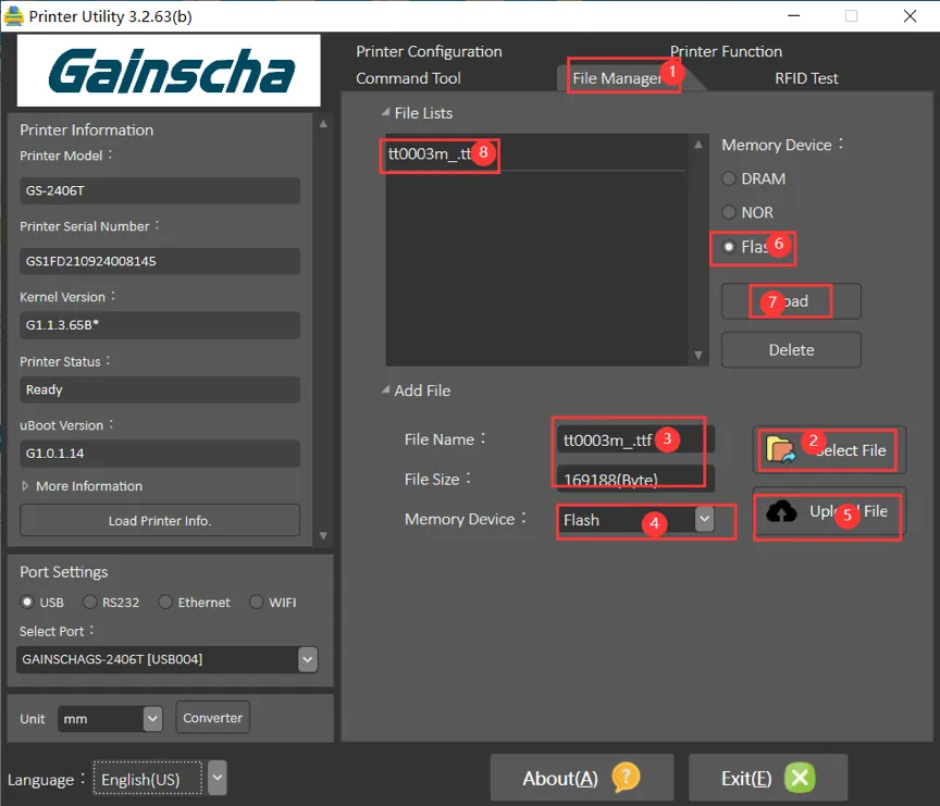 Steps 1-5 in the image are the process for uploading the font to the printer. Steps 6-8 verify the correct font upload.