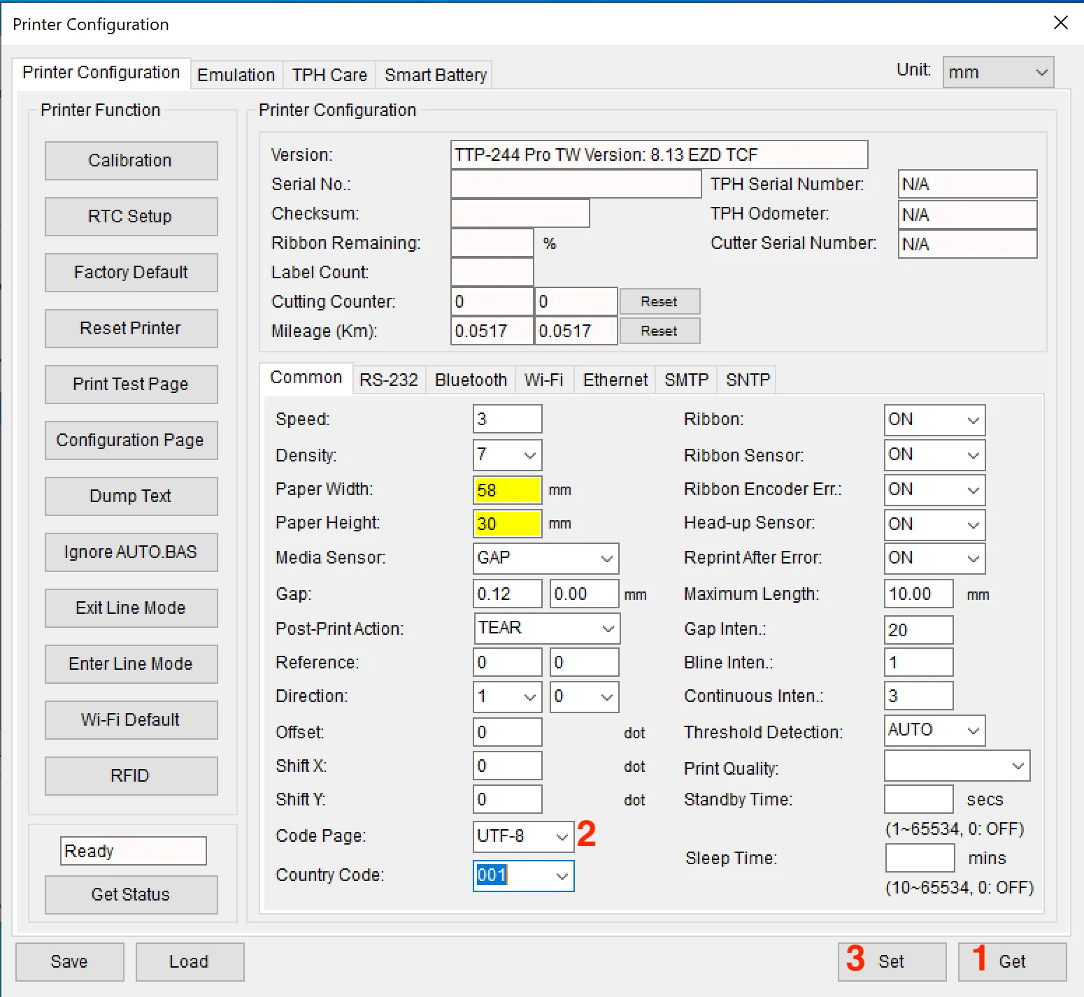 Section titled “Configuring Cyrillic Support for TSC TTP Printers”To configure Cyrillic support, set the printer’s code page to UTF-8. Use the TSC Console utility (bundled with the printer or available from the official website), connect to the printer, and follow the steps shown in the image.