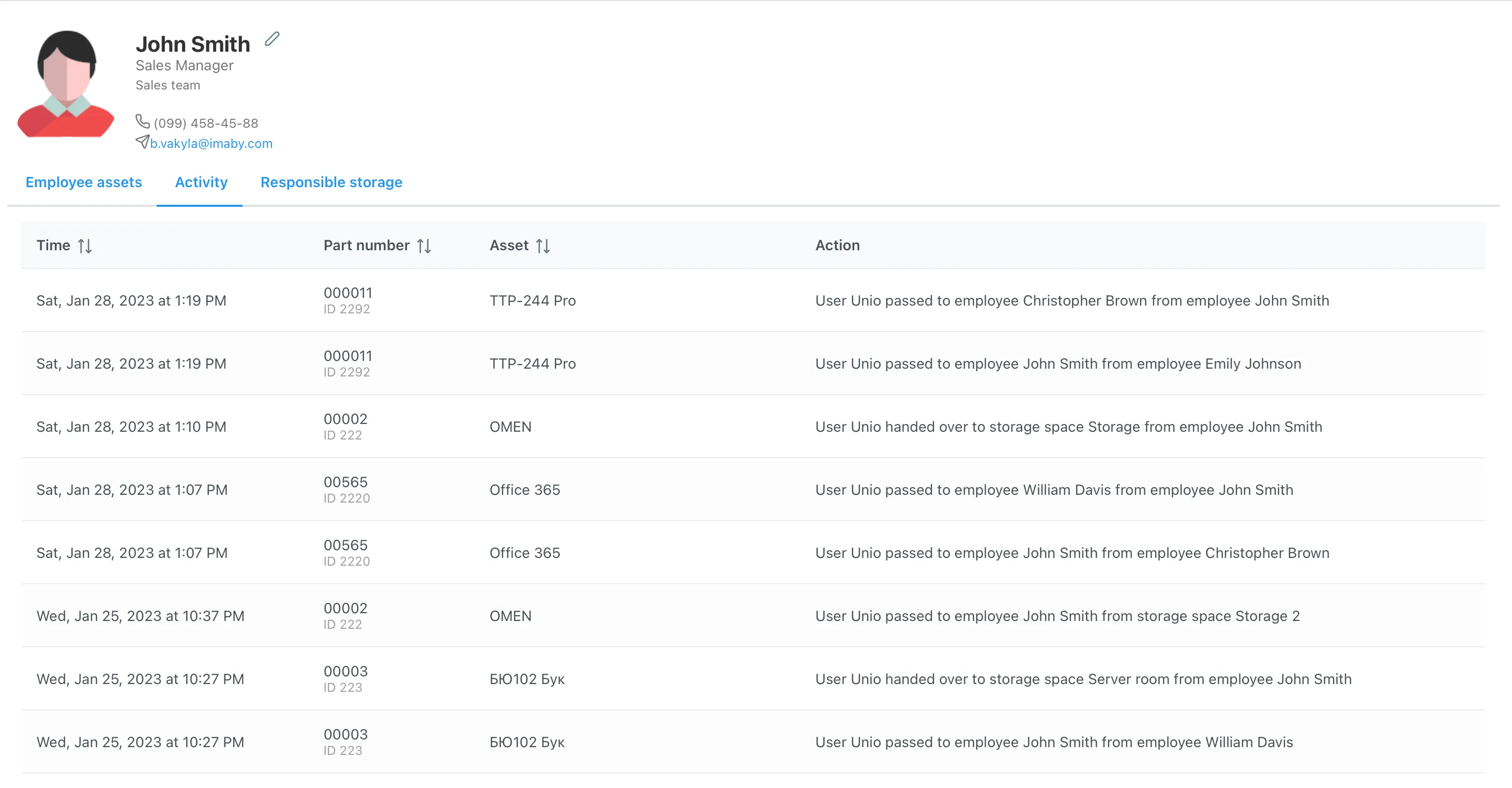 - История действий, связанных с этим сотрудником (когда и кто выдавал или забирал актив)