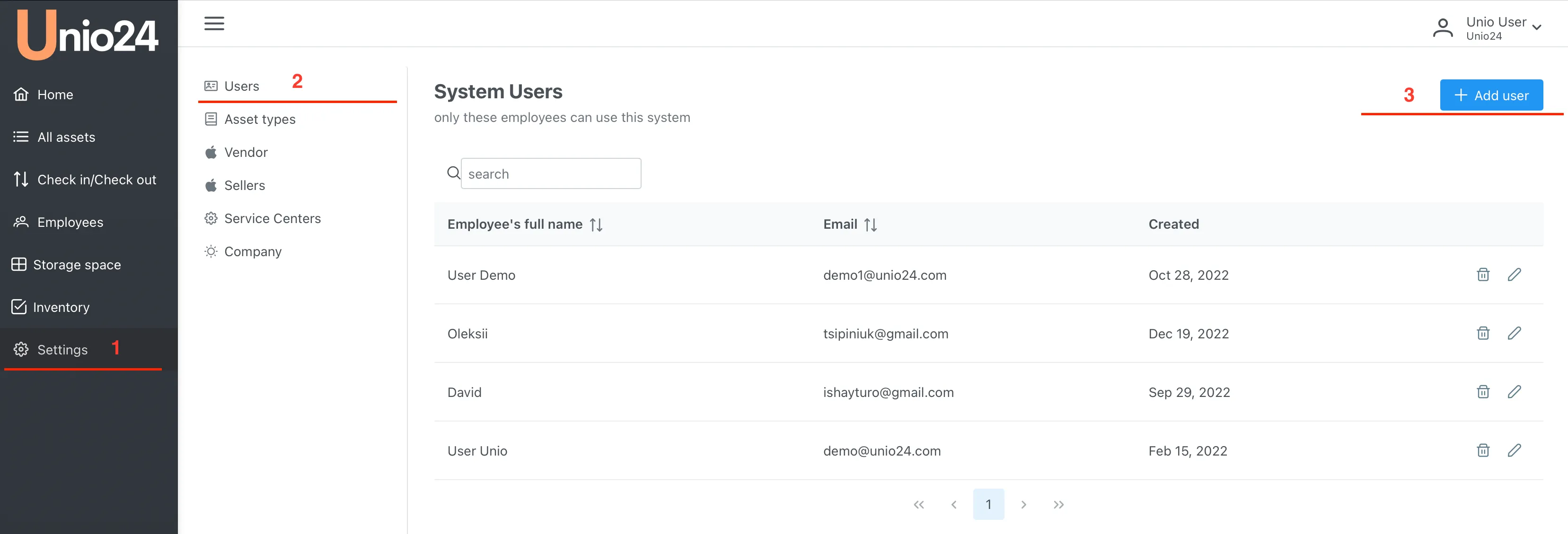 Для просмотра и управления текущими пользователям системы, Вам необходимо перейти в “Настройки” (1) -> “Пользователи” (2)