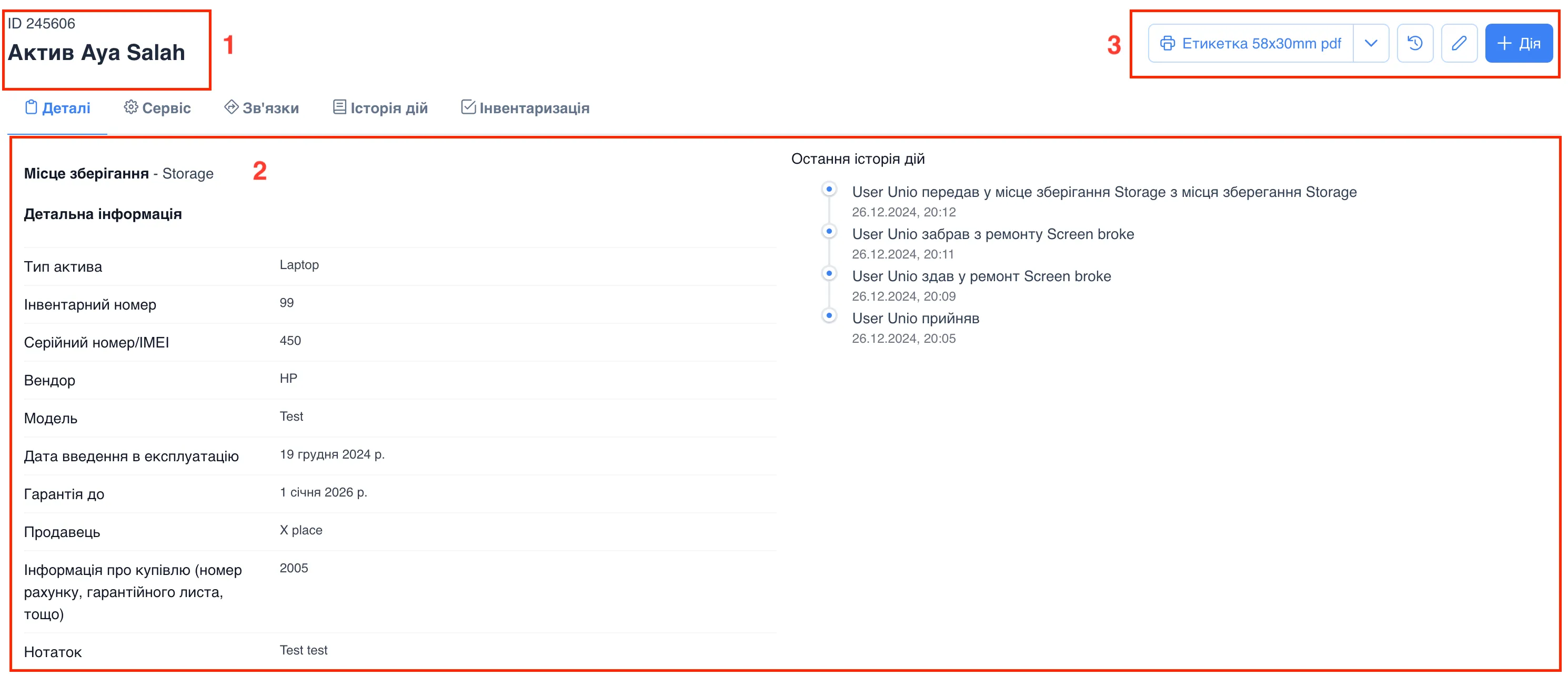 Section titled “Картка активу”Картка Активу складається з трьох частин: