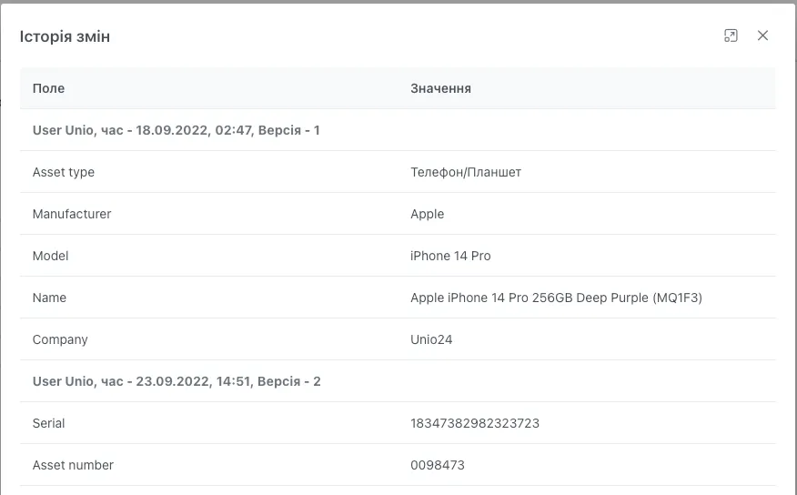Section titled “Історія змін активу”Система зберігає всю історію змін полів активу. Для того, щоб подивитися, хто і коли та які зміни вніс у картку Активу, вам потрібно в картці Активу натиснути на кнопку “Історія змін”