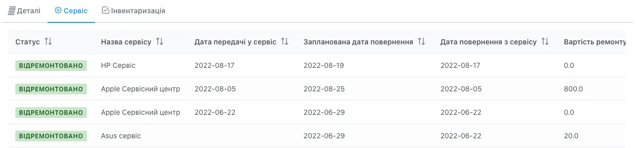 Вкладка “Сервіс” відображає детальну інформацію щодо сервісного, гарантійного та післягарантійного ремонту