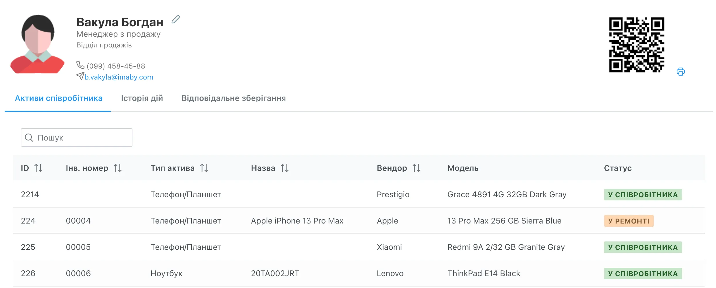 - Історія дій, пов’язаних із цим співробітником (коли і хто видавав або забирав актив)