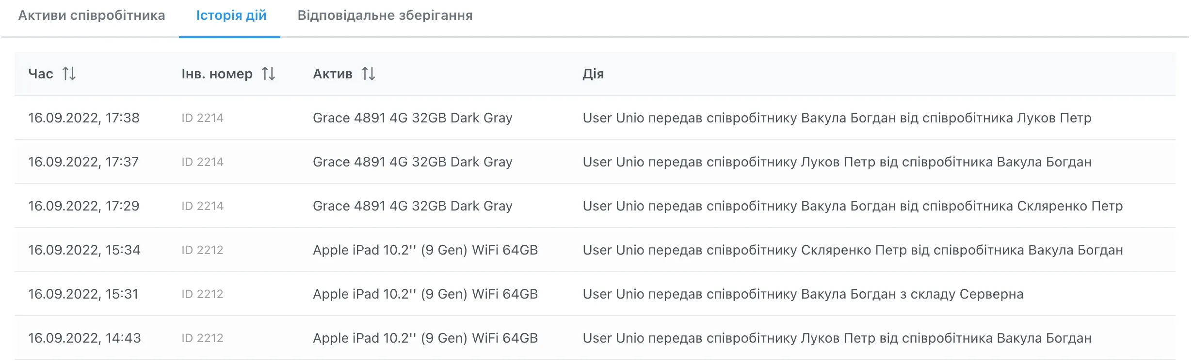 Section titled “Історія дій”Історія дій - відображає всі пересування активів, у яких цей співробітник отримував або віддавав актив.