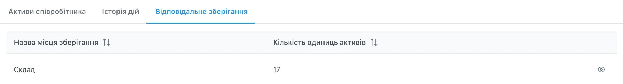 Section titled “Відповідальне зберігання”Відповідальне зберігання - місце зберігання активів, за яким цей співробітник закріплений як відповідальна особа